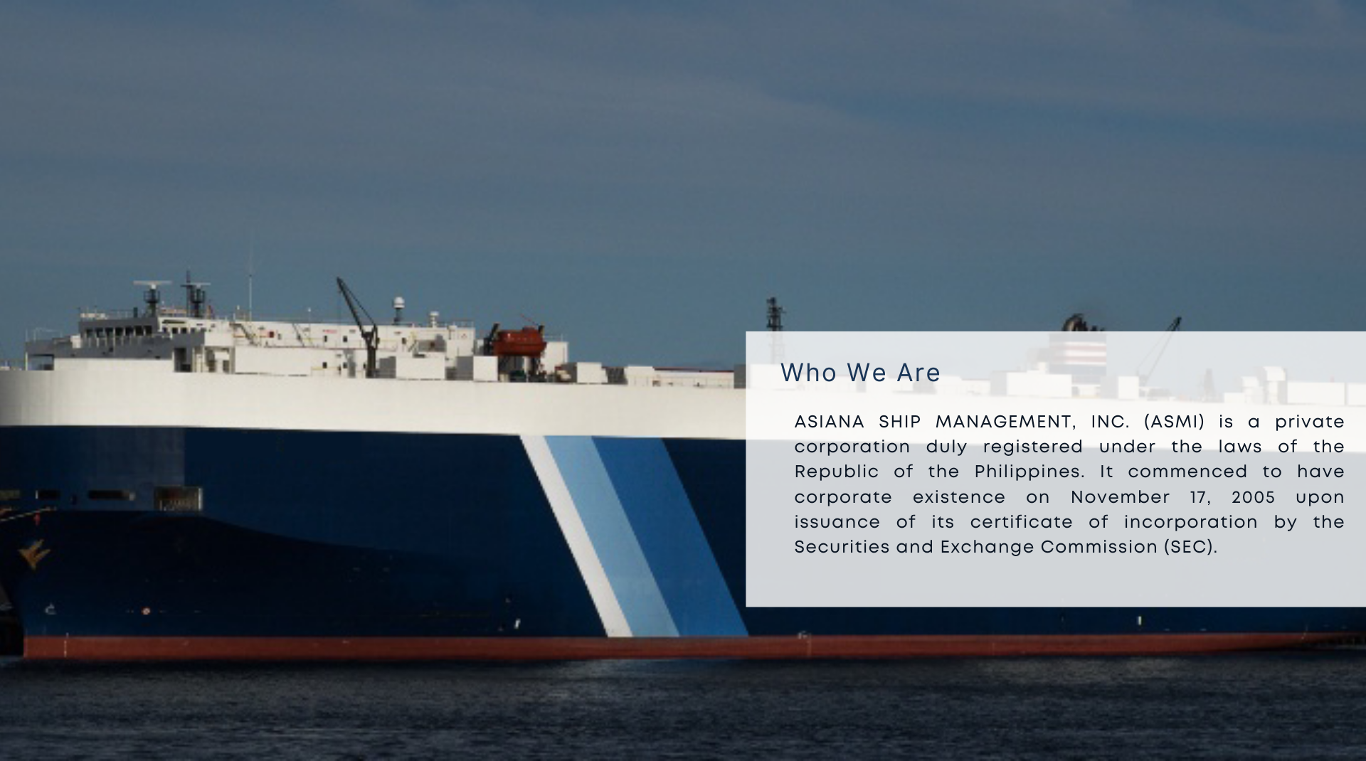 ASIANA SHIP MANAGEMENT, INC. (ASMI) is a private corporation duly registered under the laws of the Philippines. It commenced to have existence on November 17, 2005 upon issuance of its certificate of Incorporation by the Securities and Exchange Commission (SEC).